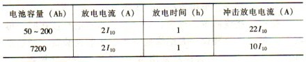 2)事故過程中沖擊電流放電能力。當(dāng)蓄電池容量達(dá)到滿容量時(shí),按0.1110放電1h后,在不停電放電狀態(tài)下,沖擊電流疊加到表2-3規(guī)定的沖擊電流時(shí)進(jìn)行放電,共放電10次,每次時(shí)間為500ms,時(shí)問間隔為2s,放電后直流母線電壓不低于90%UN。