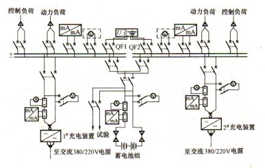 (3)方案三:?jiǎn)文妇€分段(一組蓄電池,兩套充電裝置)接線,見圖2-3。特點(diǎn):接線可靠、靈活,一組蓄電池經(jīng)兩個(gè)空氣斷路器分別接到兩段母線上。兩套相同容量的充電裝置接在不同